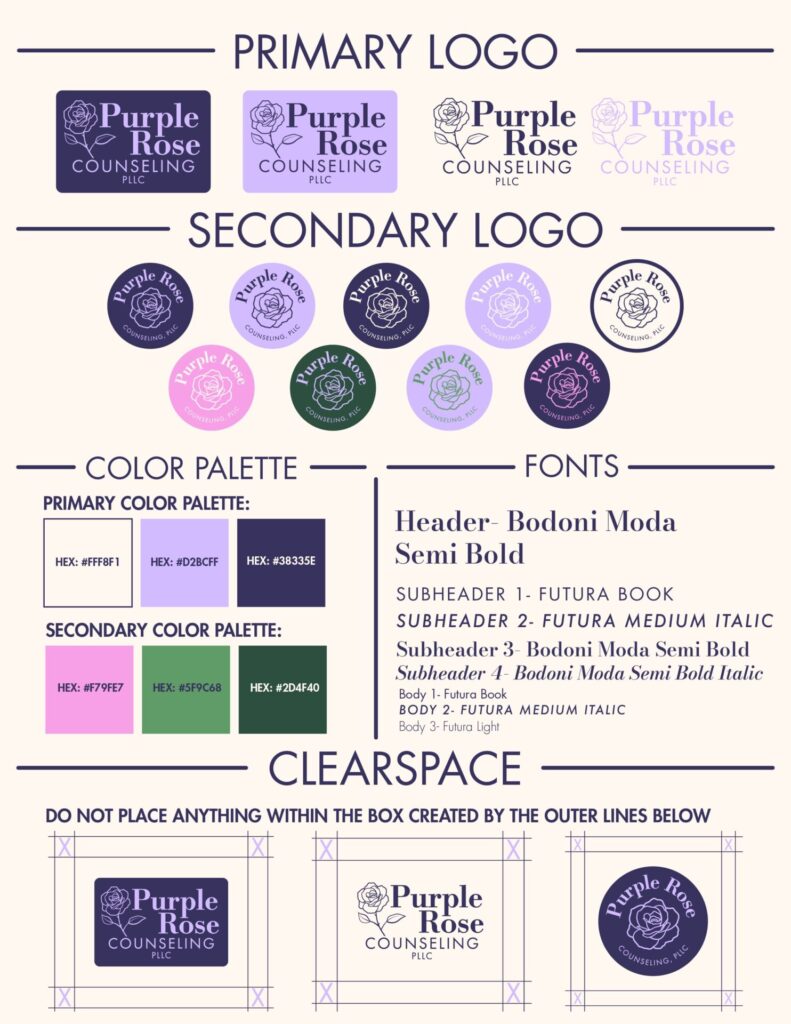 The images below were original iterations of the logo that I created for Purple Rose Counseling, LLC. Initially, I sent the first three iterations to give her options to choose between and get an idea of the direction she was leaning towards. From these first iterations, she asked me to combine some aspects of all of the options. She liked the colors of the first one, the font of the “Purple Rose” in the second one and the actual rose of the third. Another request was for it not to be arched. We also discussed the hierarchy of text, as she wanted “Counseling” to be more prominent. However, with my experience and some research I explained to her that I would recommend focusing on the name of the company first over the services that are offered. I chose to show her new versions that show both levels of hierarchy. In the end she agreed and wanted the one where the company name was more prominent. The only request she had after choosing iteration five was to remove the stem below the “o” of counseling. That is how we landed on the current primary logo.